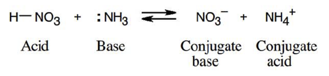 Problem 2-11. Nitric acid (HNO3) reacts with ammonia (NH3) to yield ammonium nitrate. Write the reaction, and identify the acid, the base, the conjugate acid product, and the conjugate base product.