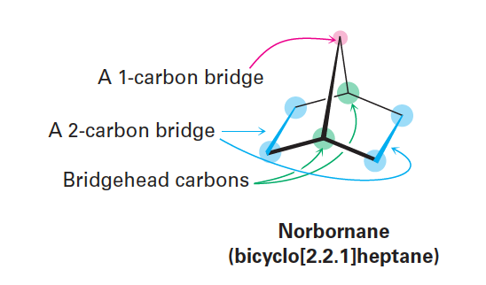 - 예시2: Norbonane 또는 bicyclo[2.2.1]heptane은 두 고리가 끊어져야 비고리 형태가 되기 때문에 bicyclicalkane이라 한다. 명칭에서 알 수 있듯이 총 7개의 탄소로 구성되어 있으며, 두 개의 다리목 탄소(2, 2)와 두 개의 다리목 사이의 하나의 탄소(1)로 구성되어 있어 bicyclo[2.2.1]heptane이라 명명할 수 있다.