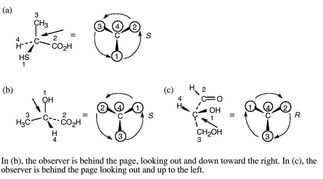 - 이렇게 카이랄 탄소에 결합된 치환기들의 우선순위를 결정하고, 우선순위가 가장 낮은 치환기(4)를 우리로부터 멀리 뒤로 향하도록 배치하고 분자 배향에 따라 나머지 우선순위를 시계 방향 혹은 반시계 방향으로 배열한다.