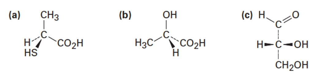 ❗️ tip: 가장 우선순위가 낮은 치환기가 뒤쪽으로 가도록 바라본다고 상상하고 분자 배치를 그려본다. 예를 들어 (c)와 같이 4번 치환기가 그림 상 위쪽에 위치할 경우, 해당 분자를 아래에서 바라본다고 생각하고 배치하면 S configuration이 된다.