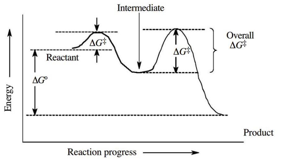 - 이처럼 여러 단계로 반응이 진행되는 경우 각 단계마다 그와 관련된 활성화 에너지와 ΔG°를 가지지만, 반응의 전체 ΔG°는 반응물과 최종 생성물 사이의 에너지 차이다.