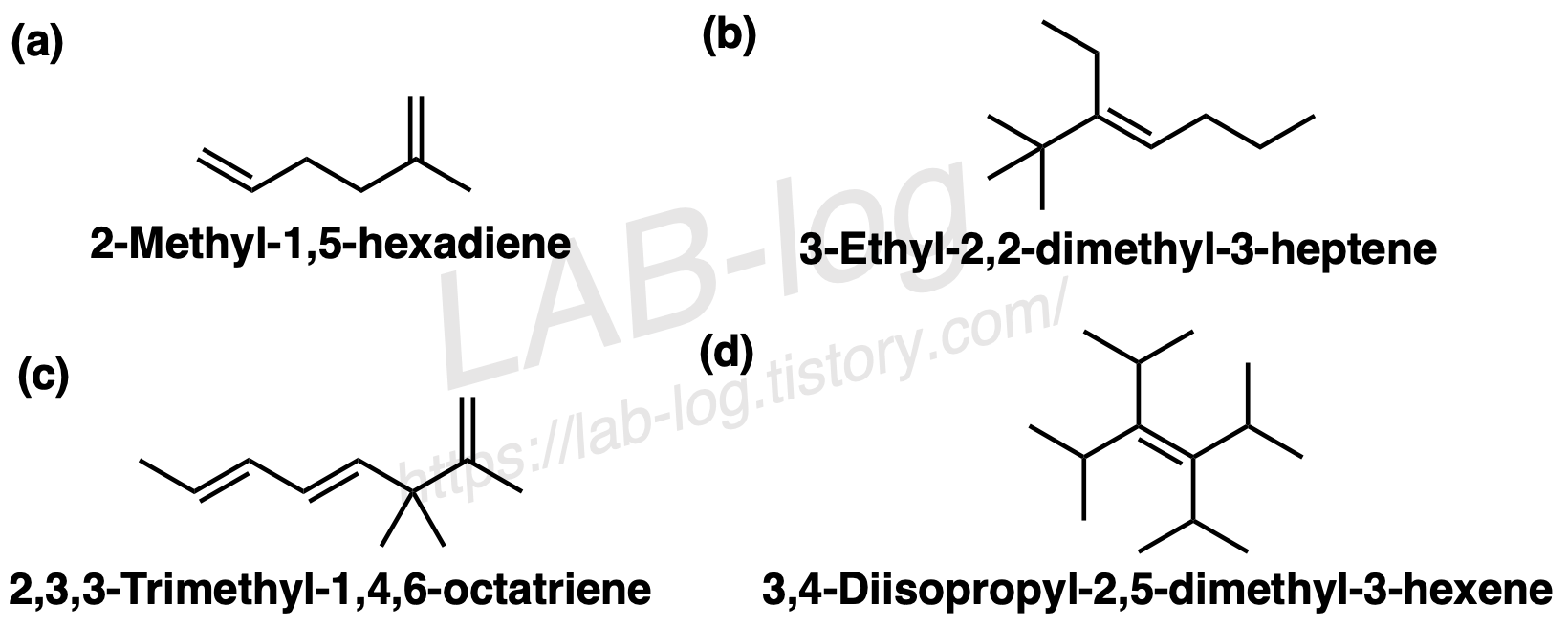 - 완전한 이름을 적어라. 이중 결합의 위치는 첫 번째 알켄 탄소의 번호를 부여하고, 모체 이름 바로 앞에 번호를 적는다. 이중 결합 수에 따라 접미사 -diene, -triene 등을 사용한다.