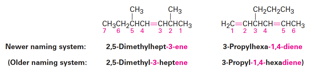 - 단, 1993년 개정된 새로운 명명 체계에서는 모체 이름 앞이 아닌 접미사 -ene 앞에 번호를 붙이기로 되어 있다. 따라서 아래 예시와 같이 2,5-dimethyl-3-heptene은 2,5-dimethylhept-3-ene으로, 3-propyl-1,4-hexadiene은 3-propylhexa-1,4-diene으로 명명한다.