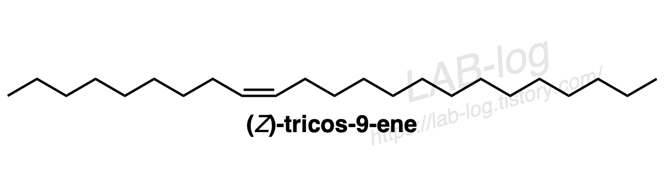 Problem 7-8. The sex attractant of the common housefly is an alkene named cis-9-tricosene. Draw its structure. (Tricosane is the straight-chain alkane C23H48.)