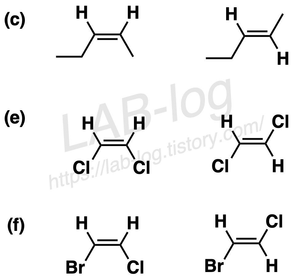 이중 결합의 각 탄소에서 두 개의 다른 치환기가 있는 화합물만이 cis-trans isomer가 존재하므로 (c), (e), (f) 만이 cis-trans isomer를 가진다.
