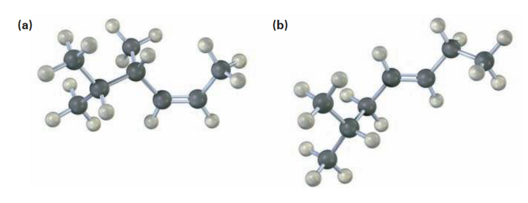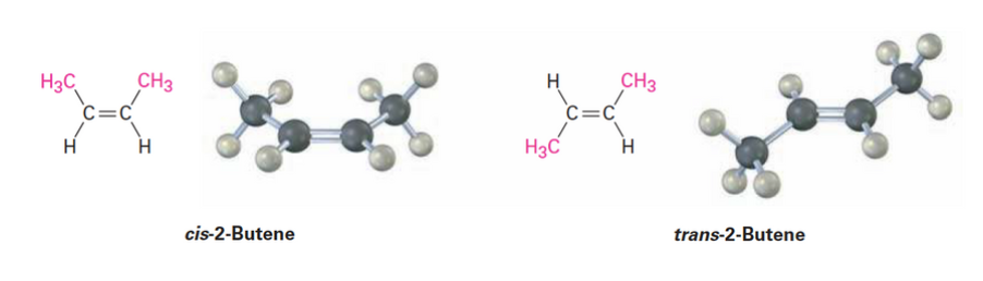 - 즉 이중 결합의 회전이 일어날 수 없기 때문에 두 개의 알켄 이성질체는 자발적으로 상호 변환될 수 없고 이들은 분리 가능한 서로 다른 화합물이 된다. 이치환 사이클로알케인의 경우와 같이 이러한 알켄 이성질체를 시스-트랜스 입체이성질체(cis-trans stereoisomers)라고 부른다.