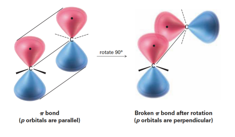 - 이렇기 때문에 단일 결합은 회전이 용이하지만 이중 결합에서는 회전이 어렵다. 이중 결합 주위를 회전시키기 위해서는 일시적으로 파이 결합이 끊어졌다가 다시 형성되어야 하기 때문이다. 따라서, 이중 결합의 회전 장벽 에너지는 적어도 파이 결합 자체의 세기보다 커야 한다.