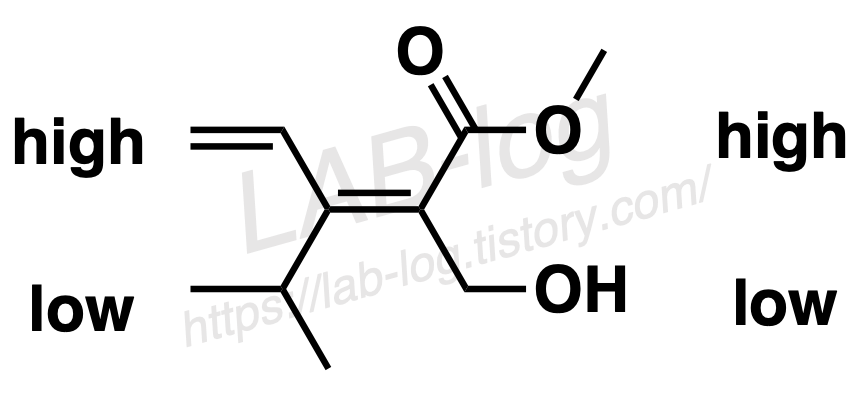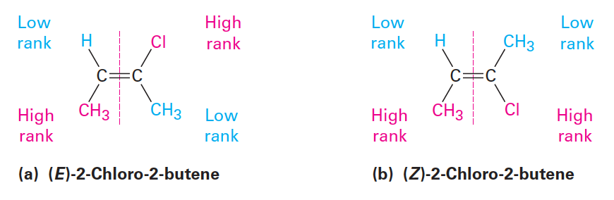 규칙 1. 이중 결합 탄소를 각각 분리하여 고려하고, 탄소에 직접 결합된 두 원자들을 찾아 원자 번호에 따라 순위를 정한다. 높은 원자 번호를 가진 원자가 높은 우선 순위를 가진다.