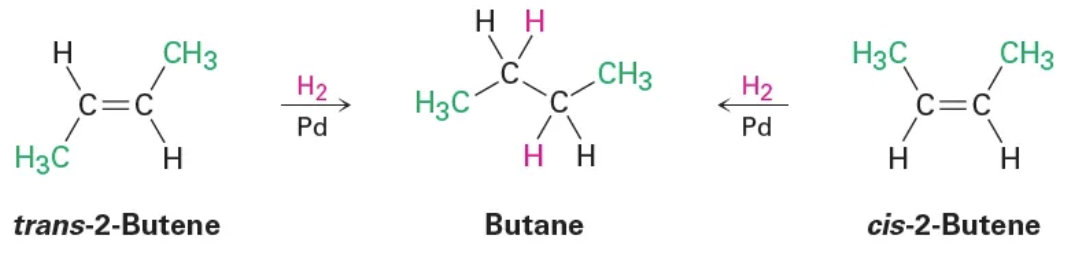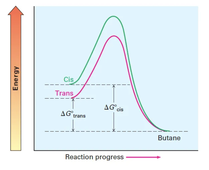 - 예를 들어 2-butene을 수소화 반응을 통해 butane으로 만든다고 하자. cis-2-butene은 trans-2-butene보다 2.8 kJ/mol 만큼 불안정하기 때문에 에너지 도표에서 더 높은 에너지 준위를 가진다. 하지만 반응 후에는 똑같은 product를 생성하므로 생성물은 똑같은 에너지 준위를 갖는다. 즉, 전체 반응의 자유 에너지 변화 (△G°)는 cis-2-butene이 2.8 kJ/mol 만큼 더 클 것이다. 이를 이용하여 반응의 수소화열(△H)을 측정하고 차이 값을 알아내어 시스와 트랜스 이성질체 사이의 안정성 차이를 알아볼 수 있다.