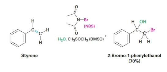 - 예: Styrene + NBS/H₂O → OH on benzylic carbon, Br on terminal carbon