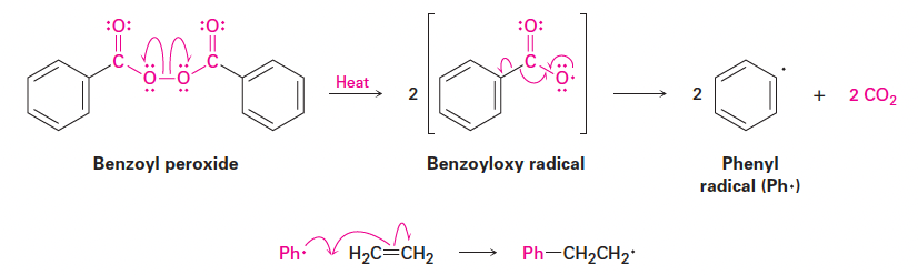 - 과산화물 O–O 결합이 열로 homolytic cleavage → benzoyloxy radical 형성 → CO₂ 방출 후 phenyl radical (Ph·) 생성.