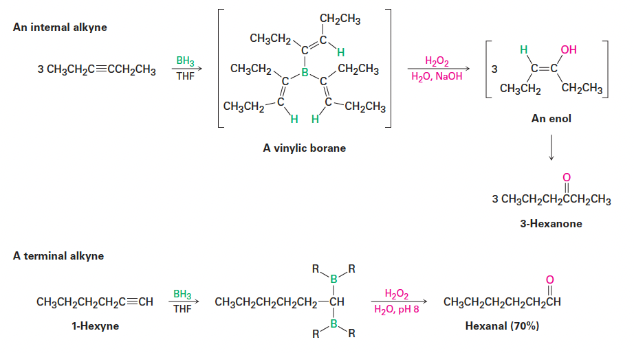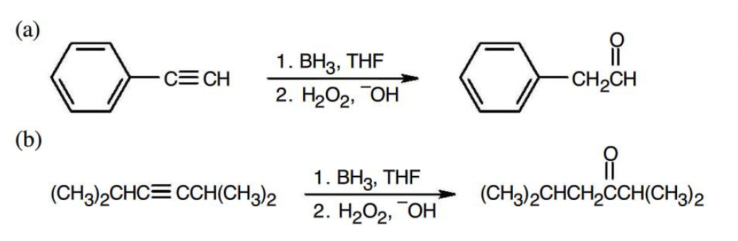 - BH₃는 알카인과 반응하여 vinyl borane을 만들고, 이후 H₂O₂/NaOH로 산화하면 enol을 거쳐 ketone 또는 aldehyde를 만든다.