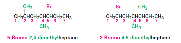 두 구조 모두 7개의 탄소를 가진 heptane을 parent chain으로 하고, 치환기의 위치가 더 낮아지는 방향으로 번호를 매긴다.