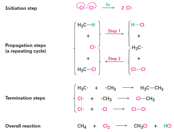 이 반응은 라디칼 연쇄 반응(chain reaction)으로 진행되며, 세 단계로 구성된다.