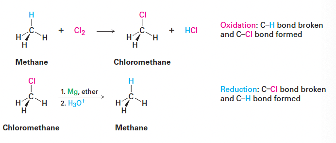 - 탄소가 더 전기음성도가 큰 원자(O, N, halogen)와 결합할수록 산화되고, 수소와 결합할수록 환원된다.