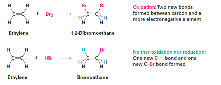- 알켄 + HBr → 알킬 브로마이드: C–H 결합 1개 + C–Br 결합 1개 형성 → 산화도 환원도 아님