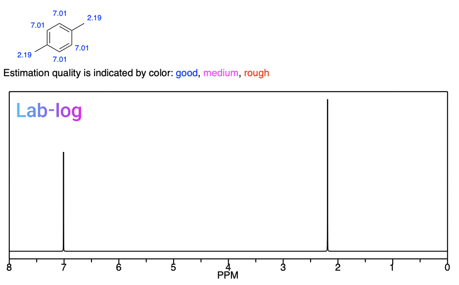 Problem 13-8. How many peaks would you expect in the 1H NMR spectrum of 1,4-dimethylbenzene (para-xylene, or p-xylene)? What ratio of peak areas would you expect on integration of the spectrum? Refer to Table 13-3 for approximate chemical shifts, and sketch what the spectrum would look like. (Remember from Section 2-4 that aromatic rings have two resonance forms.)