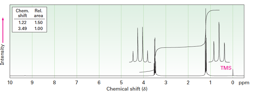 - CH₂Br 수소는 인접한 -CH₃ 탄소의 수소 3개에 의해 네 개의 피크(Quartet)로 갈라져 3.42 δ에서 나타남.
