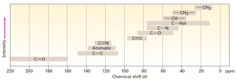 - 산소, 질소, 할로겐과 결합한 탄소는 전자를 빼앗겨 탈차폐(deshielding)되므로 낮은 자기장(왼쪽, downfield)에서 흡수함.
