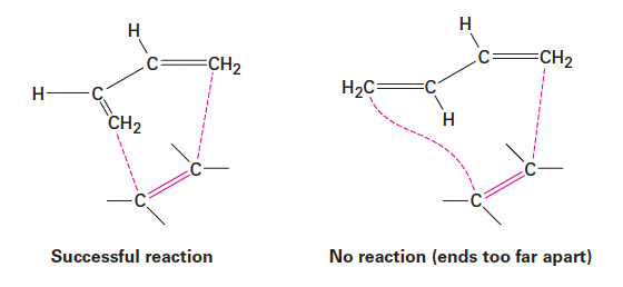 - 오직 s-cis 상태에서만 다이엔의 1번과 4번 탄소가 다이엔친화체와 동시에 결합할 수 있는 거리에 도달함.