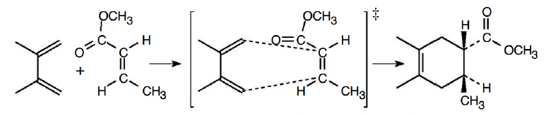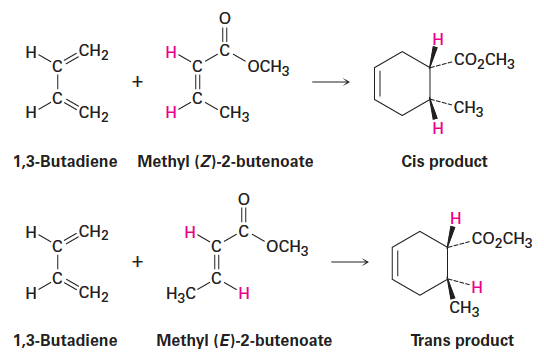 - 트랜스(trans) 다이엔친화체: Methyl (E)-2-butenoate(트랜스 형태)를 반응시키면 생성물에서도 두 치환기가 트랜스 방향으로 위치함.