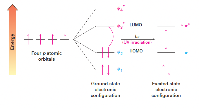 - 구체적으로 가장 높은 점유 분자 궤도함수(Highest Occupied Molecule Orbital, HOMO)에 있는 파이 전자가 가장 낮은 비점유 분자 궤도함수(Lowest Occupied Molecule Orbital, LUMO)로 촉진됨.