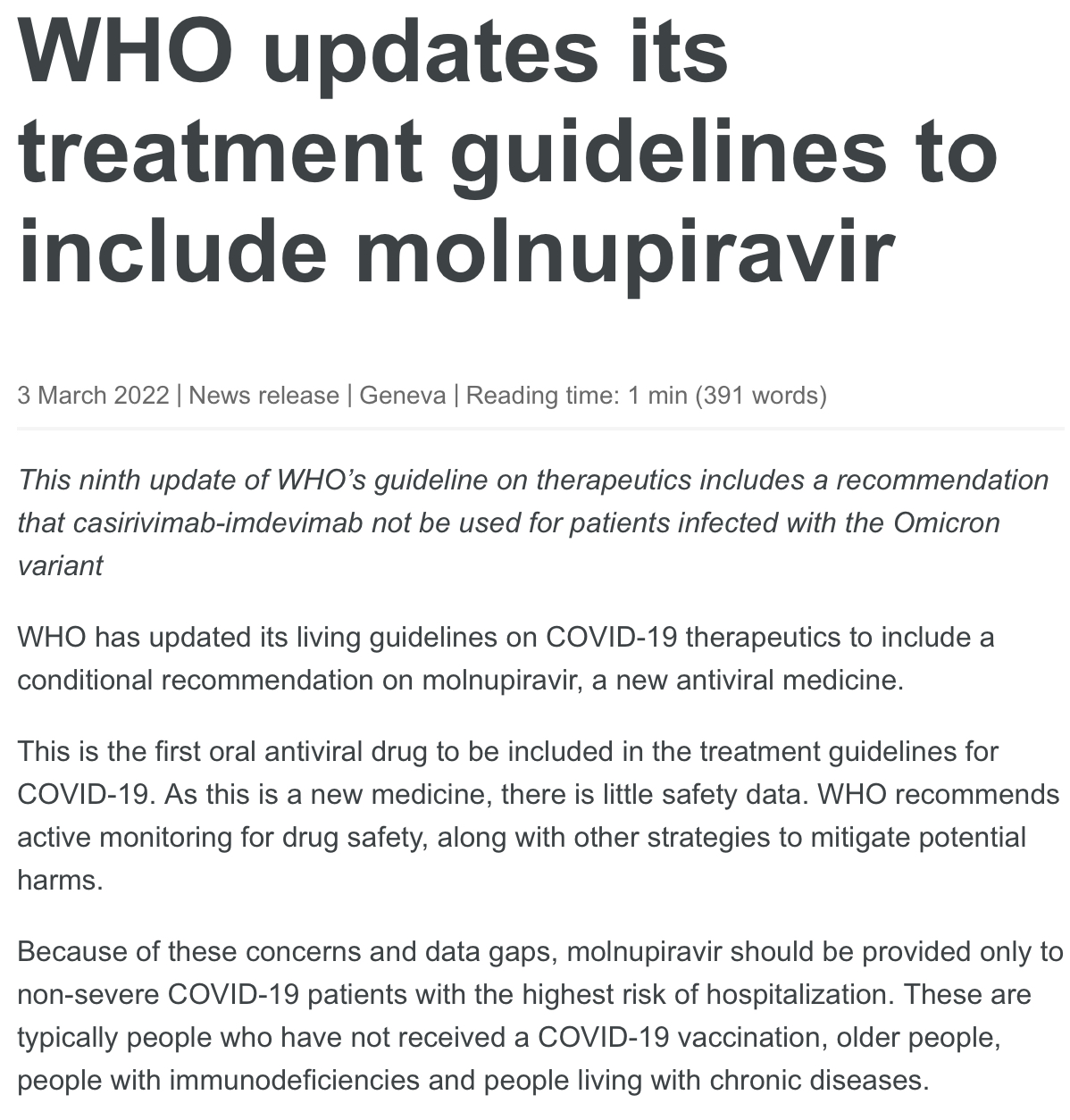 2021년 11월 FDA에 보고된 보고서에서도 몰누피라비르의 코로나19 바이러스에 대한 효능이 약 30% 정도로 낮아 논란이 되었습니다. 이후 각종 연구에서 몰누피라비르는 의학적으로 효과가 없다*, 오미크론에는 효과가 있다** 등 여러 의견이 나와 혼란이 가중되고 있습니다. 이런 와중 2022년 3월 3일 FDA에서는 몰누피라비르의 투여에 대한 가이드라인을 추가했는데요.