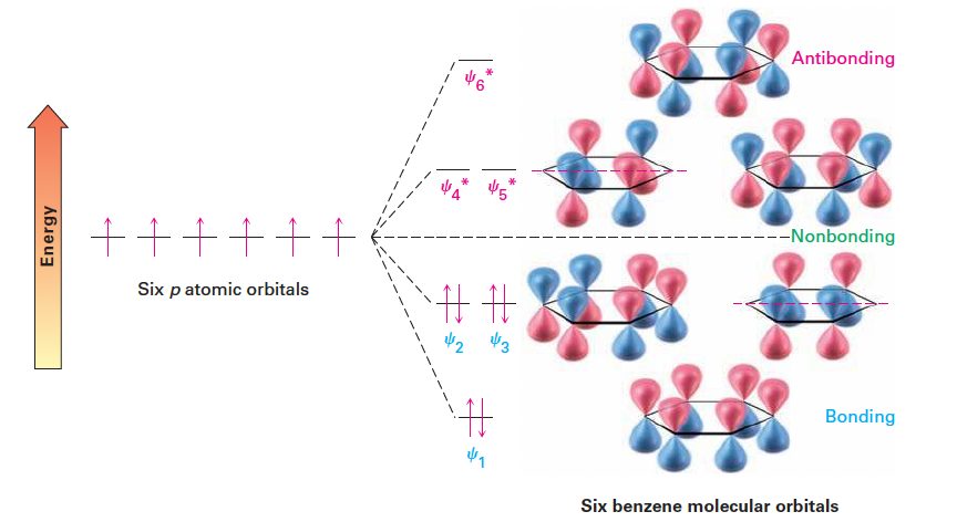- 이처럼 전자가 에너지가 낮은 결합성 궤도에 완전히 비편재화되어 채워지는 것이 벤젠의 특별한 안정성(150 kJ/mol)을 유발함.