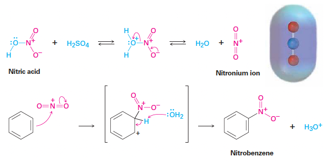 - 친전자체인 니트로늄 이온(NO2+)은 HNO3가 양성자화된 후 물 분자가 이탈하면서 형성됨.