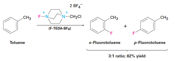 - F-TEDA-BF4(Selectfluor): 양전하를 띤 질소에 불소가 결합된 형태의 "F+" 공급원을 사용하여 치환