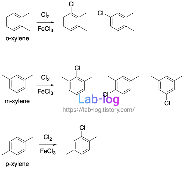 Problem 16-3. How many products might be formed on chlorination of o-xylene (o-dimethylbenzene), m-xylene, and p-xylene?