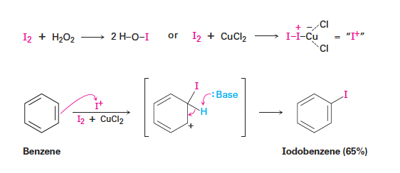 - I2 + H2O2 or CuCl2 (산화제) 첨가 → "I+" 같은 강력한 친전자성 종을 만들어 반응