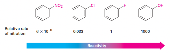 - 활성제 (Activators): 벤젠보다 반응 속도를 빠르게 함. (예: -OH기는 벤젠보다 약 1000배 더 반응성이 큼.)