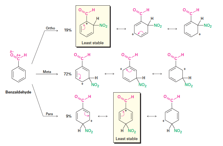 - ortho 및 para 위치:카보닐기(-CHO)와 같이 양전하를 띤(δ+) 원자가 고리에 직접 붙은 경우, ortho 및 para 공격 시 양전하가 서로 인접하는 매우 불안정한 공명 구조가 형성됨.