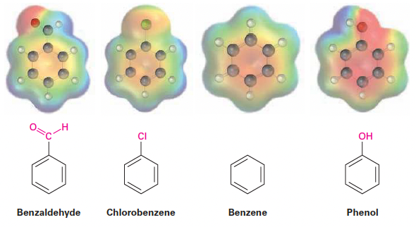 - 공명 전자 공여(Resonance electron donation): 비공유 전자쌍을 가진 치환기가 π 결합을 통해 고리에 전자를 제공함. 할로젠, 하이드록실, 알콕실(-OR), 아미노(-NH2) 기가 해당함.