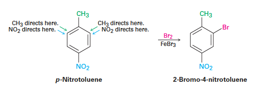 - 예시: p-니트로톨루엔(p-nitrotoluene)의 브로민화.