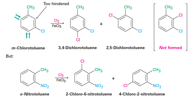 - meta-이치환 화합물에서 두 그룹 사이의 위치에는 새로운 치환기가 잘 들어가지 않음. (해당 위치의 입체 장애가 너무 크기 때문)