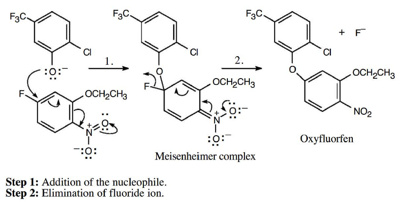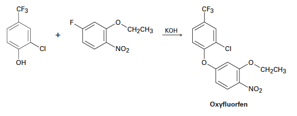 Problem 16-16. The herbicide oxyfluorfen can be prepared by reaction between a phenol and an aryl fluoride. Propose a mechanism.