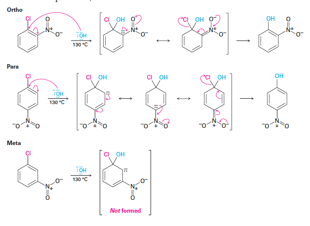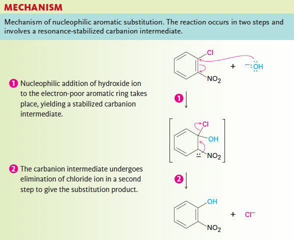 - 친핵성 첨가: 친핵체가 할로젠이 결합된 탄소를 공격하여 공명 안정화된 음이온 중간체인 Meisenheimer complex를 형성함.