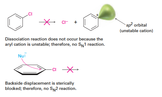 - SN1 반응 불가: 아릴 양이온(aryl cation)이 매우 불안정하여 해리 반응이 일어나지 않음.