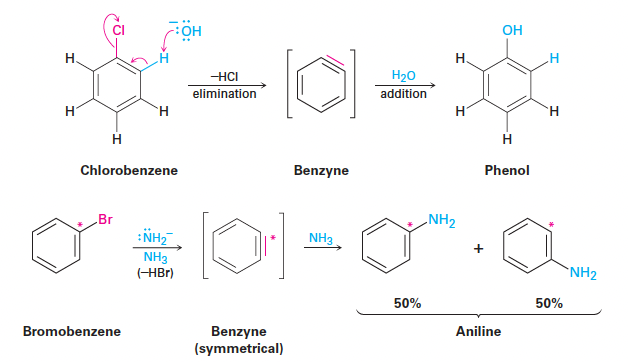- 브로모벤젠의 C1 위치에 방사성 동위원소 14C를 표시하여 KNH2와 반응시키면, C1과 C2 위치에 각각 50%씩 치환된 아닐린이 생성됨.