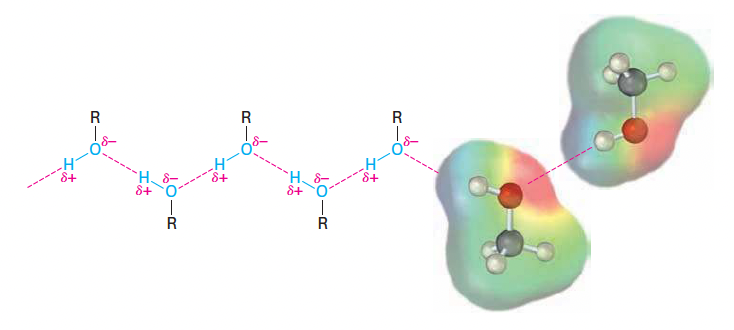 - 수소 결합(Hydrogen-bonding)으로 인해 분자 간 인력이 강하며, 비슷한 분자량의 알케인이나 할로알케인보다 끓는점이 높음.