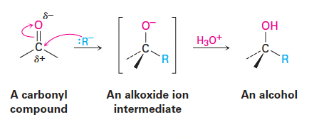 - 친핵체인 R:- 가 카보닐 탄소를 공격하여 사면체형 알콕사이드 중간체를 형성함.