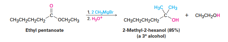 - 에스터(Ester): 삼차(3°) 알코올 생성 (그리냐르 시약 2당량 소모).