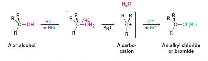 - 3차 알코올: 0°C에서 HCl 또는 HBr과 반응하여 SN1 메커니즘으로 진행함.