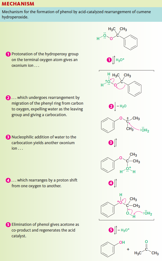 - 이를 산 처리하면 페놀(phenol)과 아세톤(acetone)으로 전환됨.