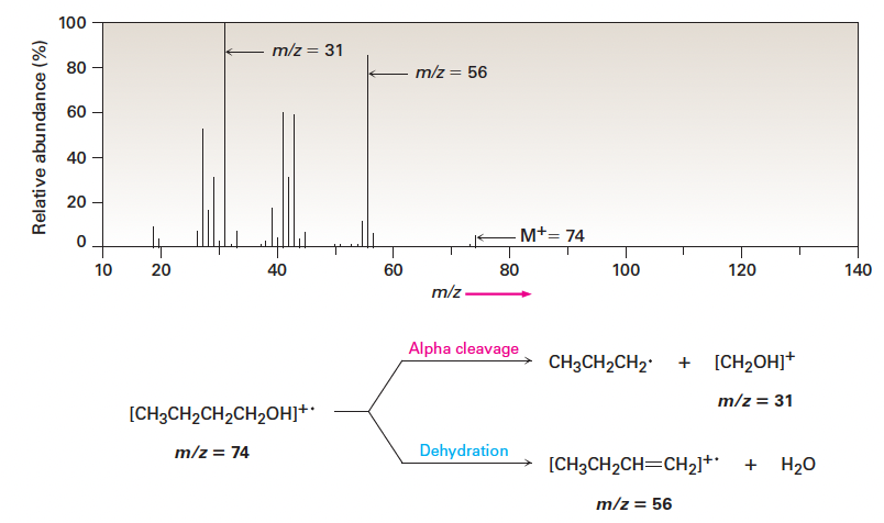 - 예: 1-부탄올(M+=74)은 알파 절단에 의해 m/z=31 피크를, 탈수에 의해 m/z=56 피크를 나타냄.