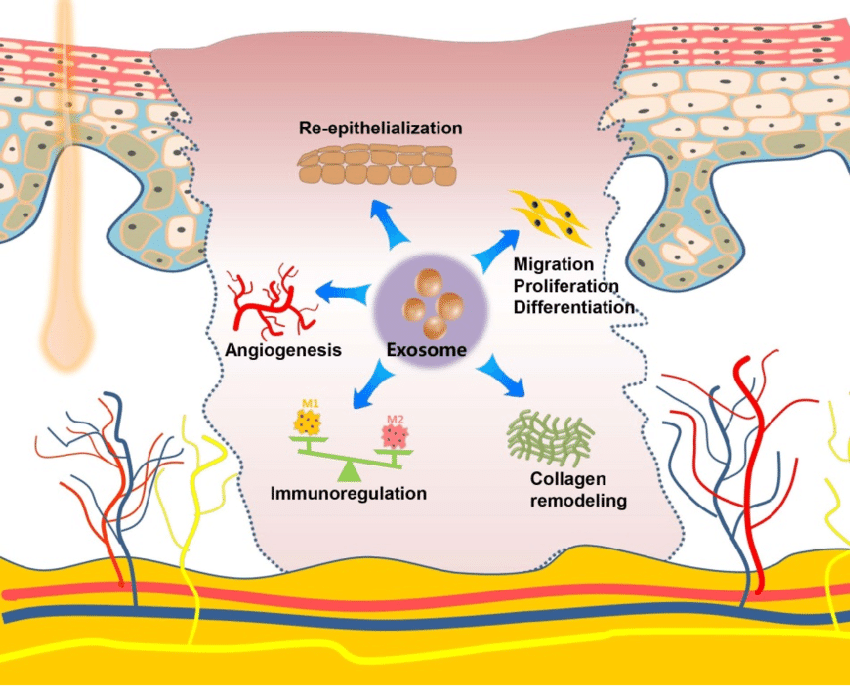 - 세포 간 신호 전달 및 재생 유도: 엑소좀은 건강한 세포에서 유래한 재생 정보를 손상된 세포에 직접 전달한다. 이를 통해 노화된 섬유아세포의 기능을 회복시키고 콜라겐과 엘라스틴의 합성을 강력하게 촉진한다.