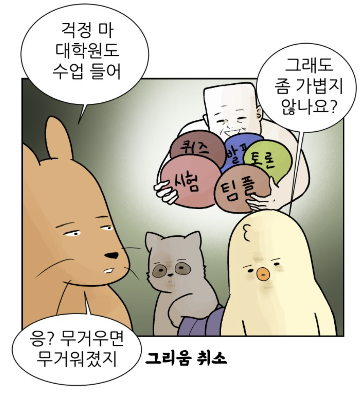 최근 대학원의 실상을 아주 잘 알려주고 있는 네이버 웹툰 <대학원 탈출일지>의 한 컷이다. 웹툰에서 교수님이 안고 있는 퀴즈, 발표, 팀플, 시험, 토론.. 어쩐지 익숙하지 않은가? 맞다. 이공계 대학원 강의 또한 학부 강의와 유사하게 진행하시기도 한다. 대학원 전공 필수 과목인 경우 단순하게 이론 강의 + (과제) + 시험으로 구성되는 경우도 있고, 최신 연구 동향에 대한 발표나 토론이 메인으로 진행되는 과목도 있다. <대학원 탈출일지> 웹툰의 댓글을 보면 지도교수 대신 대학원생들이 챕터 별로 강의를 진행하기도 했다는 댓글이 있는데, 나는 지금까지 그런 강의를 경험해보지는 못했다. 이러한 대학원 수업들은 대부분 학부에서 배운 내용을 토대로 대학원에 맞게 더욱 심화해서 수업을 하기 때문에, 이론 자체가 어려운 경우도 있고 이론을 최신 연구에 적용한 사례들을 배우기도 한다. 간혹 친절하신 교수님들께서는 학부 때 배운 전공 지식부터 설명해주시는 경우도 있는데, 그렇다고 어렵지 않은 건 아니다. (.. 당연하다.)
