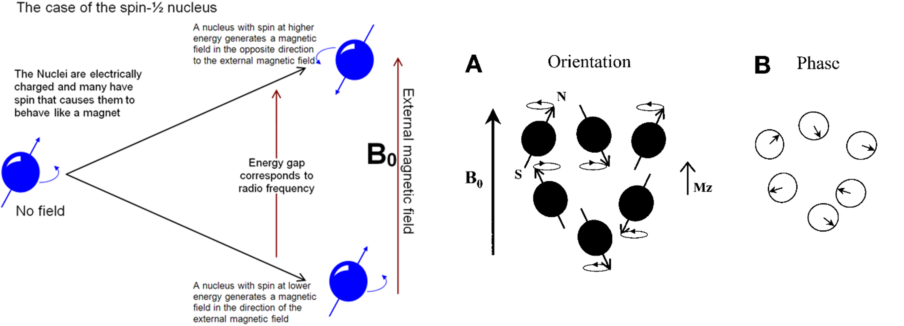 이때 원자 고유의 radio frequency (RF)에 맞는 에너지 차이 만큼의 자기장을 가하게 되면 해당 원자의 핵 스핀 축은 자기장과 동일한 방향(낮은 에너지 상태)과 반대 방향(높은 에너지 상태)으로 정렬이 됩니다.